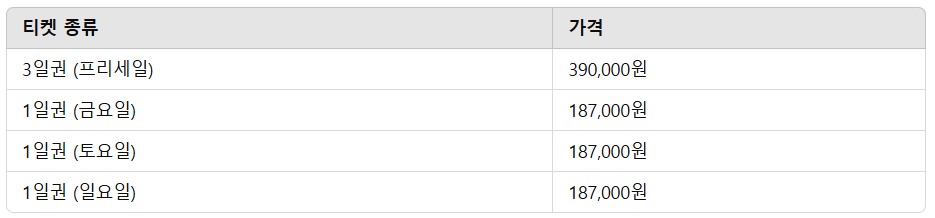 3일권(프리세일): 390,000 / 1일권: 금/토/일 각각 187,000원